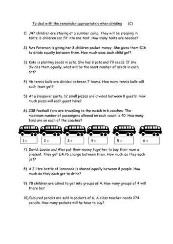 Worksheet For Solving Division Word Problems Where The Remainder Needs Dealing With Teaching Resources